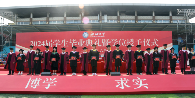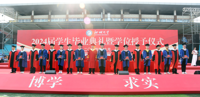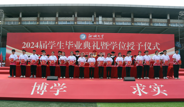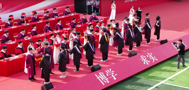 学校领导、学位委员会成员庄严地为毕业生代表颁发毕业证书和学位证书,拨正流苏,并同毕业生合影留念。党委领导班子成员为2024届优秀毕业生代表和为2024年西部计划志愿者代表颁发证书。关延平为2024年西部计划志愿服务团、研究生支教团授旗。